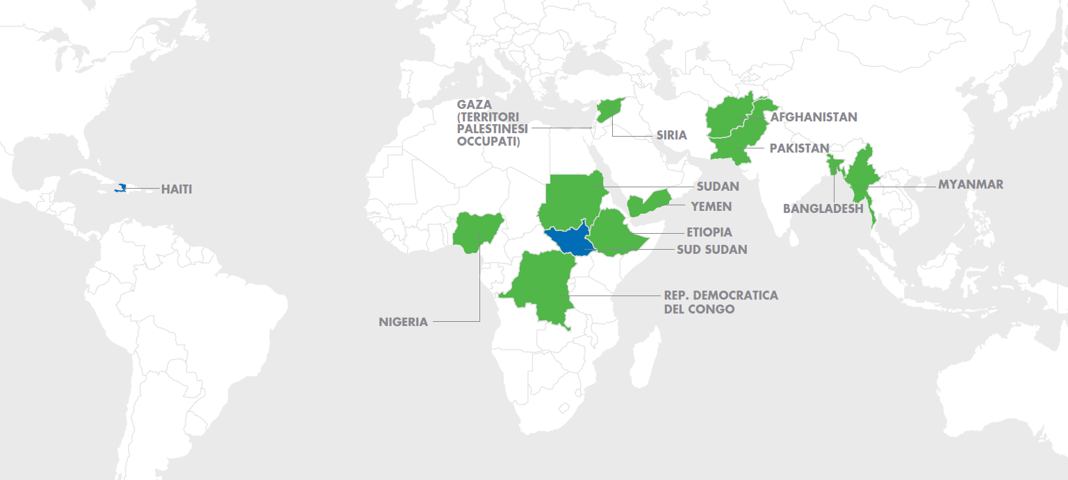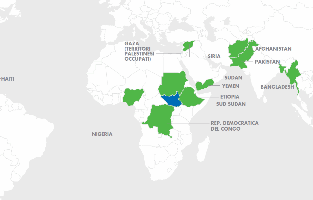 Il report si concentra sui dieci Paesi con il maggior numero di persone in insicurezza alimentare acuta (IPC Fase 3 o superiore), secondo il GRFC 2025: Nigeria, Sudan, Repubblica Democratica del Congo, Bangladesh, Etiopia, Yemen, Afghanistan, Pakistan, Myanmar e Siria.